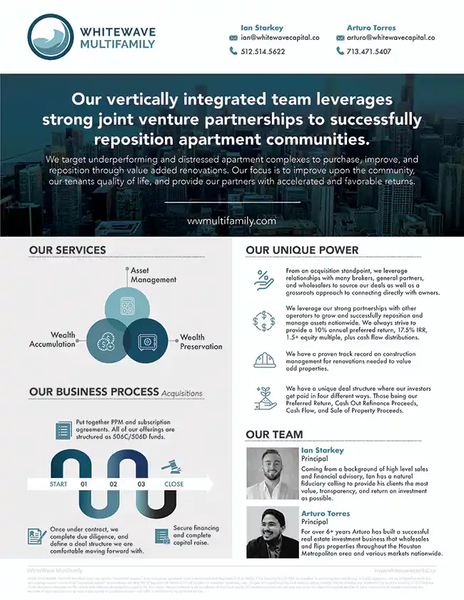 - 1-3 Page WebsiteOur Website Development Service helps you establish a professional online presence that builds credibility and attracts serious investors. We design clean, compliance-approved websites — typically one to five pages — focused on clarity, professionalism, and trust. Each site is strategically structured to highlight your investment strategy, showcase past successful deals, and feature a high-quality video introduction that positions you as an expert in your field.