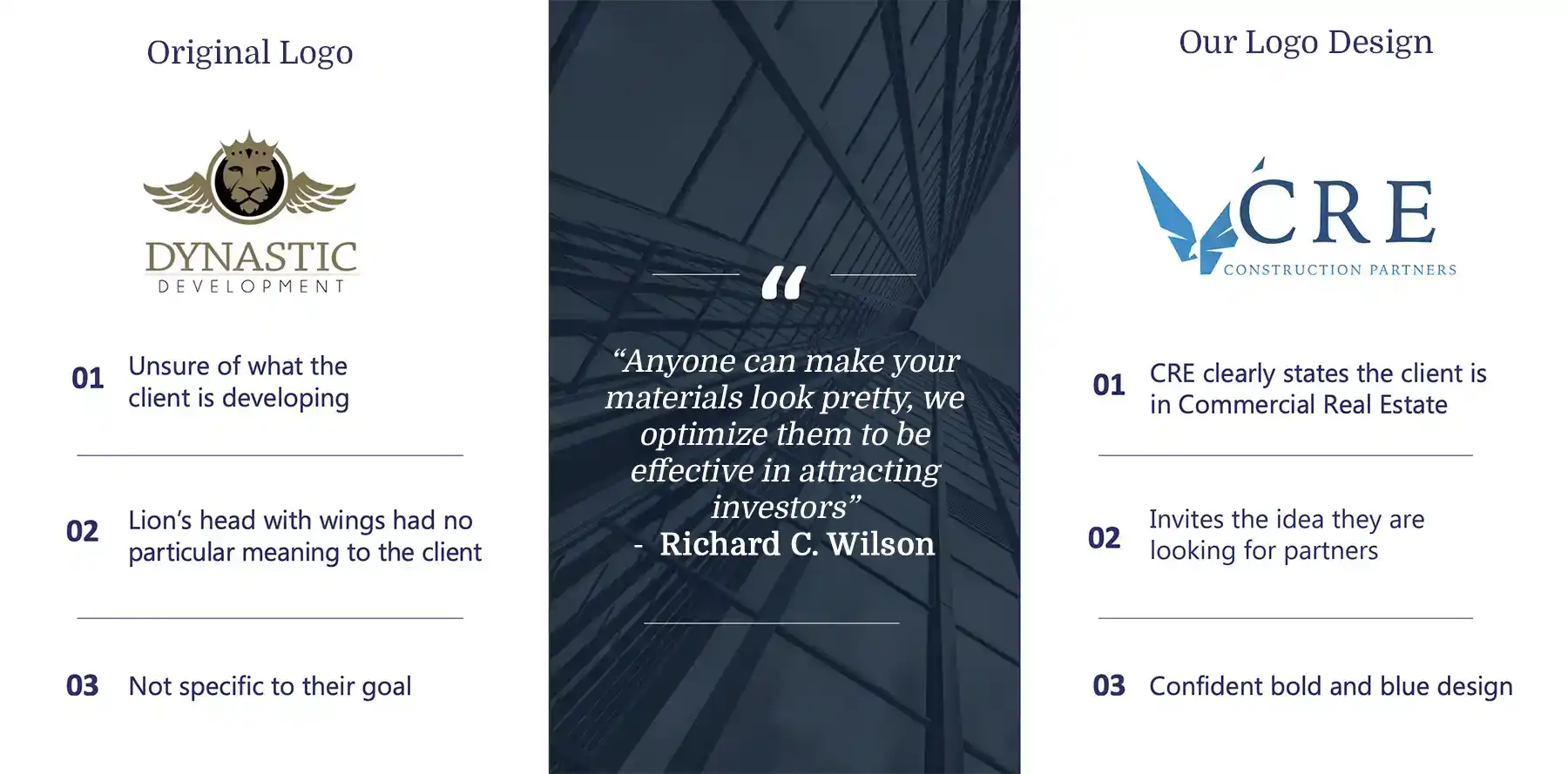 - Custom Designed Logo + BrandingOur Branding and Logo Design Service helps you present your business with the professionalism and credibility investors expect. No one will ever take your business more seriously than you do — and your branding should reflect that. A logo that looks dated, generic, or cheap sends the wrong message and instantly undermines investor confidence. We design refined, intentional branding that communicates trust, expertise, and value.