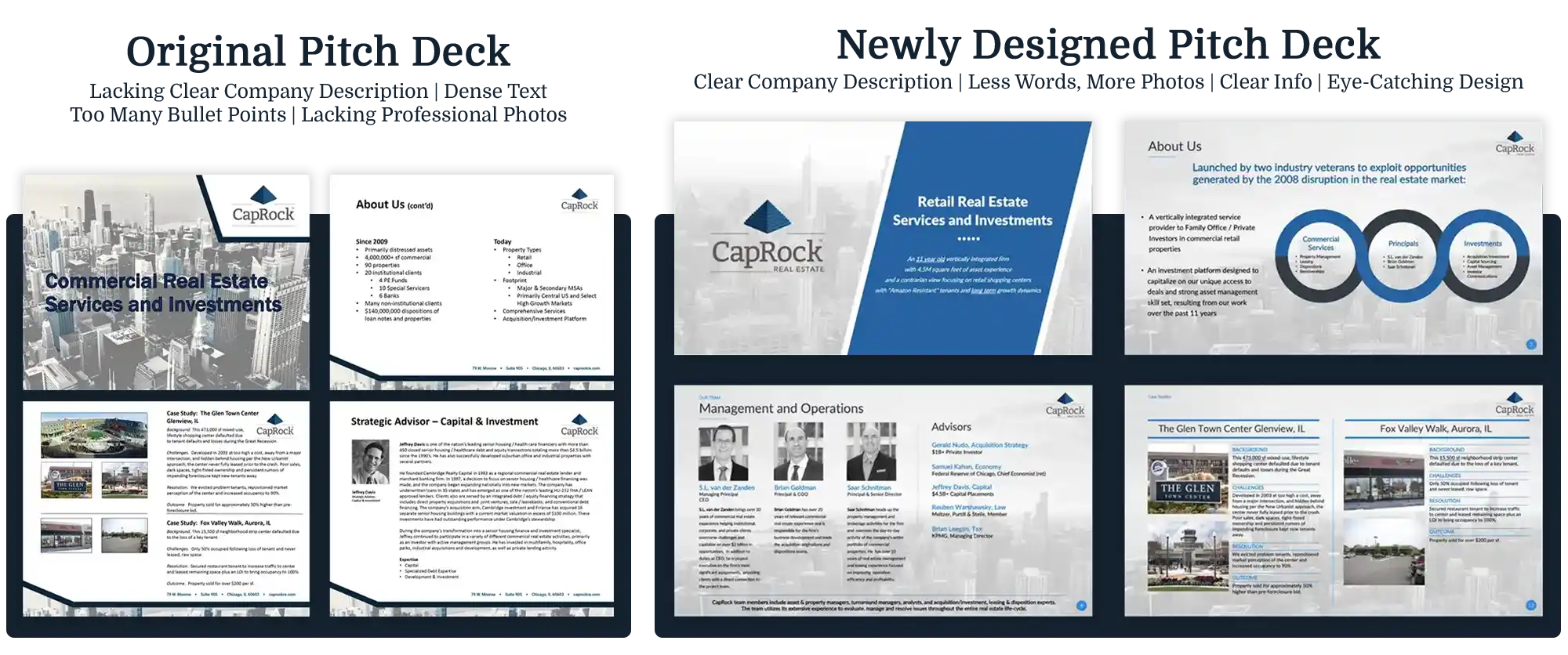 - 15 Page Pitch DeckOur Pitch Deck Design Service helps founders and capital raisers craft investor-ready presentations that command attention and drive results. Whether you need a complete pitch deck built from the ground up or a powerful refresh of your existing materials, our team transforms your vision, data, and story into a sleek, persuasive deck designed to win over investors.